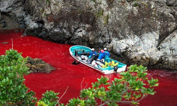 Thước phim quay bởi các nhà hoạt động của tổ chức Dolphin Project ở Taiji, phía nam Osaka, cho thấy một đàn cá heo Risso bị lùa vào vịnh nhỏ hôm 2/9. Một lúc sau, hai chiếc thuyền nhỏ kéo xác cá heo chết ra khỏi vịnh. Khi thấy camera ghi hình, ngư dân nhanh chóng che xác cá bằng vải bạt.