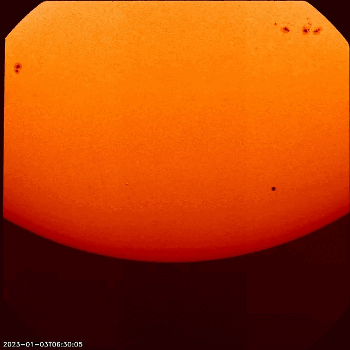 Chấm đen chuyển động trong video này là sao Thủy đi qua Mặt trời vào ngày 3/1/2023 được tàu vũ trụ ghi lại. (Ảnh: ESA,NASA)